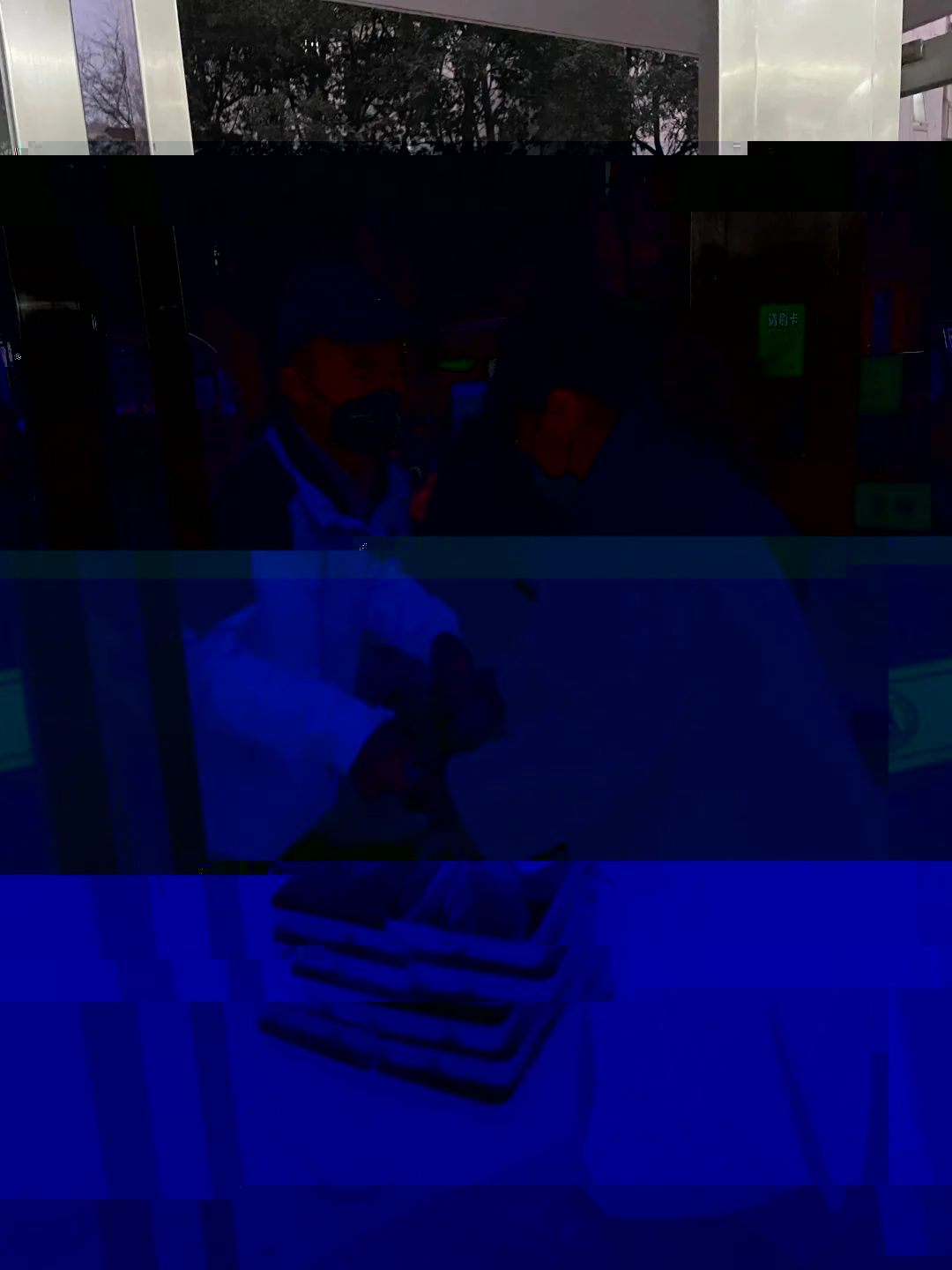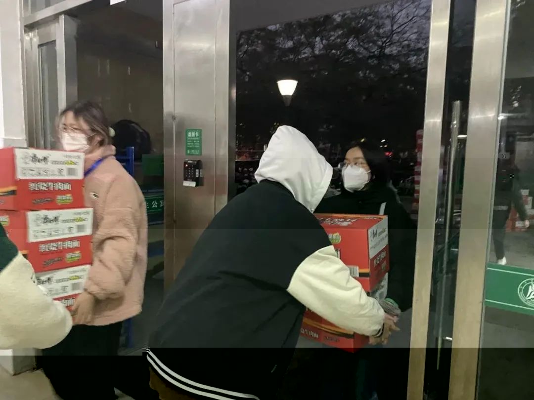 夜晚,當晚飯分發完後,他們依然沒有停下休息,而是為同學們分發各種必要物資,他們戴着口罩,呼吸沉重,但是步履堅定。經過多天的合作,老師同學們已經非常默契,一個人從另一個人手中接過這份沉甸甸的愛,再傳遞給下一個人。