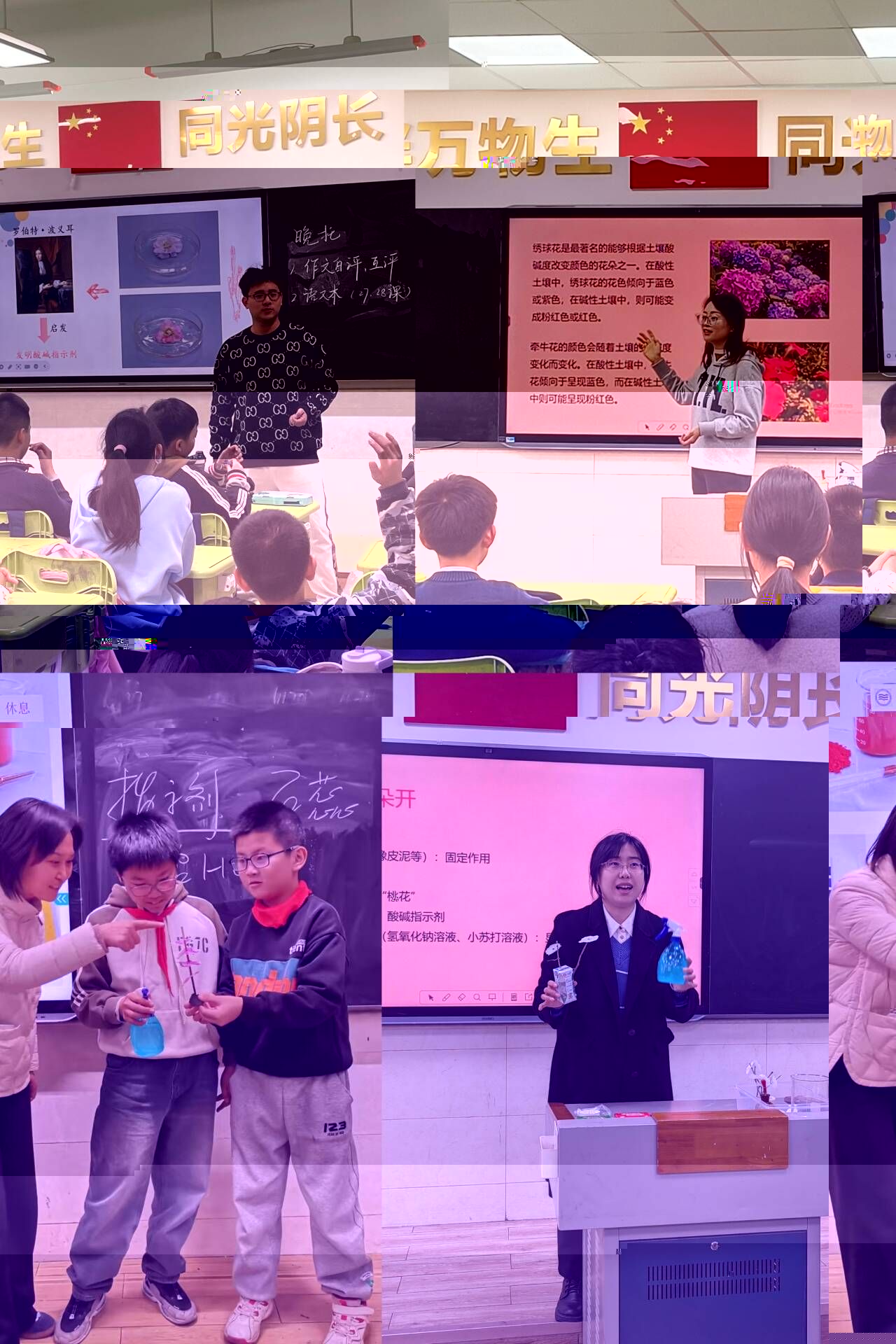 緊接着,老師們耐心地講解了花瓣變色背後的原理:酚酞溶液是一種常見的酸堿指示劑,它在酸性環境下表現為無色透明,但在堿性環境就呈現紅色。剛才噴壺裡噴出來小蘇打液體,就是一種堿性液體,酚酞一沾上小白花就秒變小紅花了。六年級(1)班的同學們興奮地說:“我沒想到小紅花的顔色變化背後竟然有這麼多科學道理,真是太神奇了!”,“老師,那我們家裡的其他花也會變色嗎?”,還有小朋友興奮地分享:“我回家後要告訴媽媽,我今天變成了一個小小的化學家!”。他們不僅學到了化學知識,還體驗到了科學實驗的樂趣。